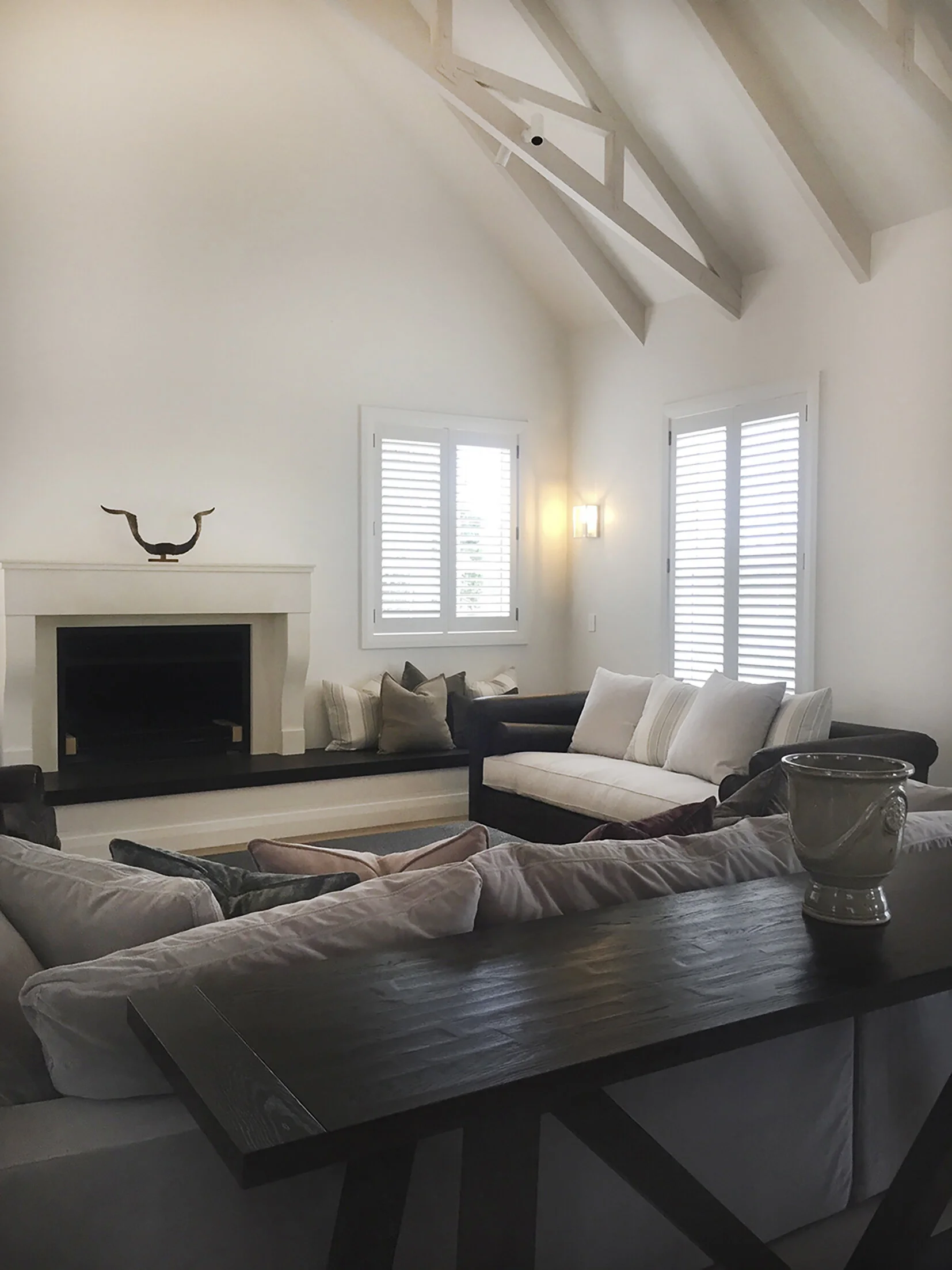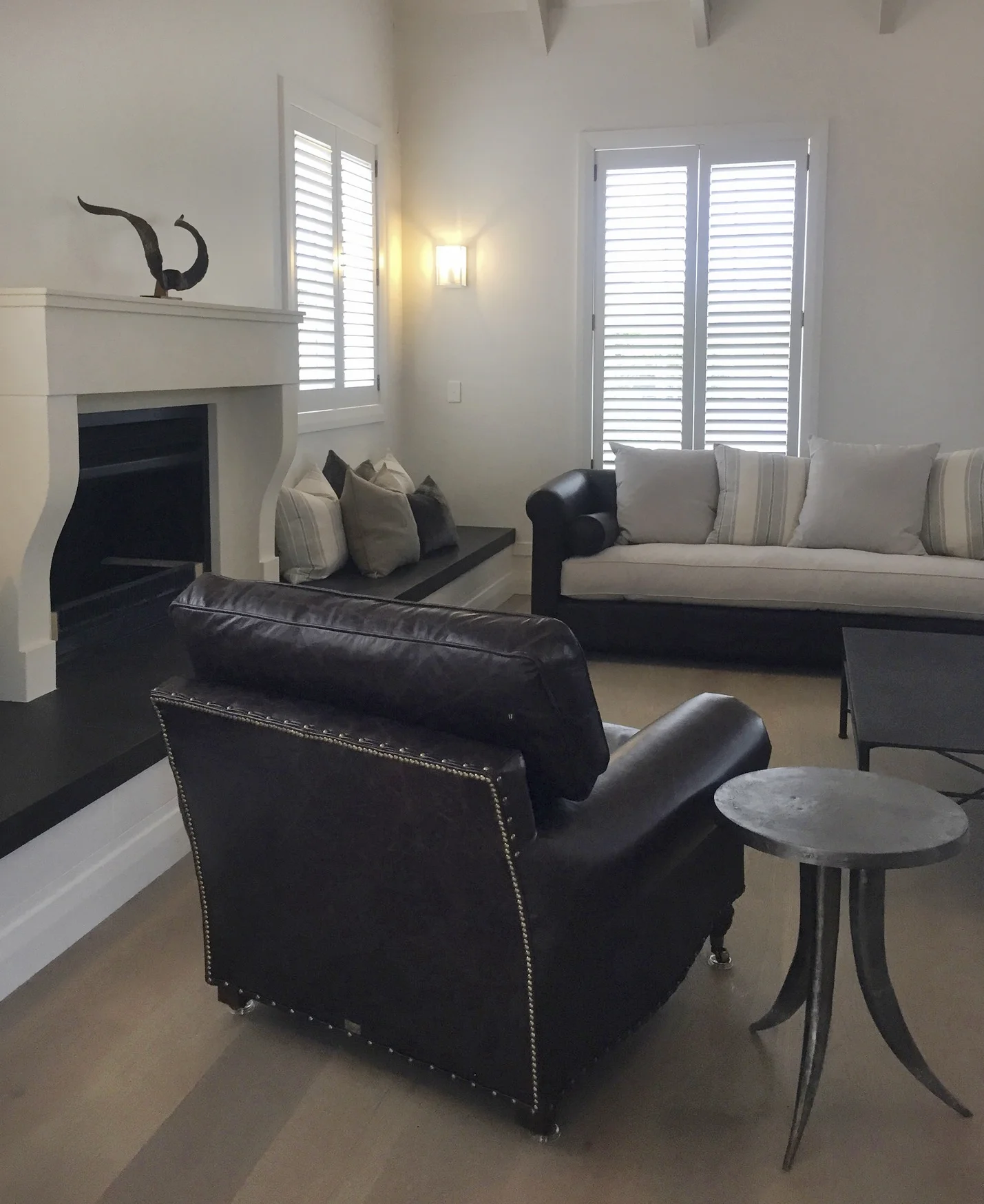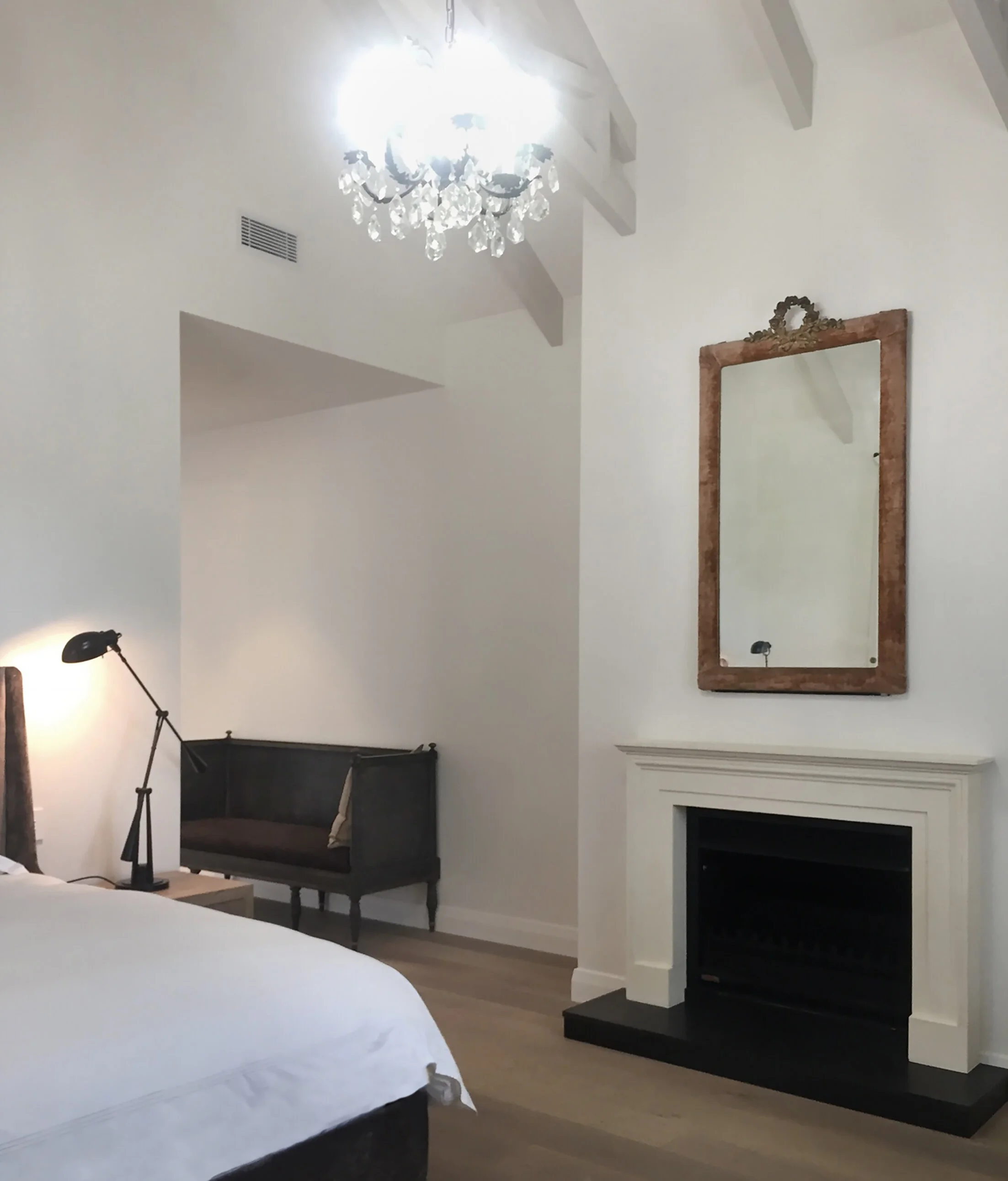 Duck Creek was designed and executed with careful attention to detail. Custom-designed and manufactured features include the large kitchen and scullery, ensuites, open fireplaces along with the wall panelling, joinery and barn doors. The lodge is sensitive to the client’s brief with a tailored flooring and lighting plan, as well as colour scheme with detailed shell pink trusses. Carefully curated antique and bespoke furniture create a sense of establishment while cushions with a custom Duck Creek Lodge monogram (DCL) designed in-house add a personal distinction and featured throughout the lodge.