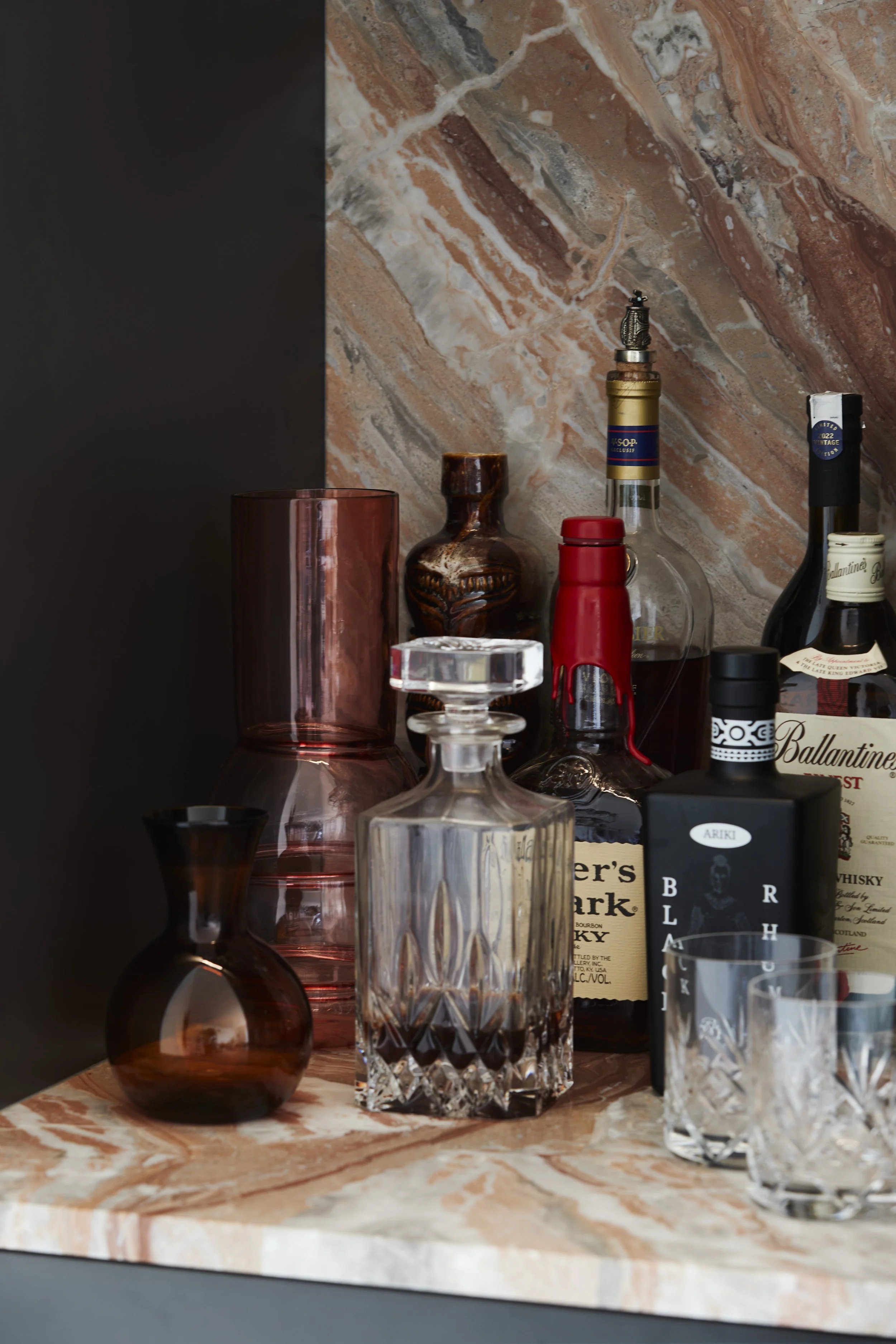 Levels were seamlessly linked by smoothing transition points and adding a new floating timber staircase rising up from casual living to the elevated lounge. The Mid-Century detailing of the original volcanic stone wall which extends from the interior retaining the elevated lounge to the exterior was restored. The base of the wall was hand-scribed showcasing the natural undulating edge, creating a detailed negative between the European oak floor, embracing the craftmanship of the original build. New feature fireplace with wide width custom tongue-and-groove panelling mimicking the original exterior cladding at the front entrance. A new kitchen layout created surprizing spatial connections, with the kitchen now flowing through to the snug, with oak cabinetry wrapping around from the concealed kitchen pantry to a hidden bar, inviting exploration. Meanwhile the Tundra marble clad island and Rosso marble vanities are a robust match for the sunlight and volcanic stone.