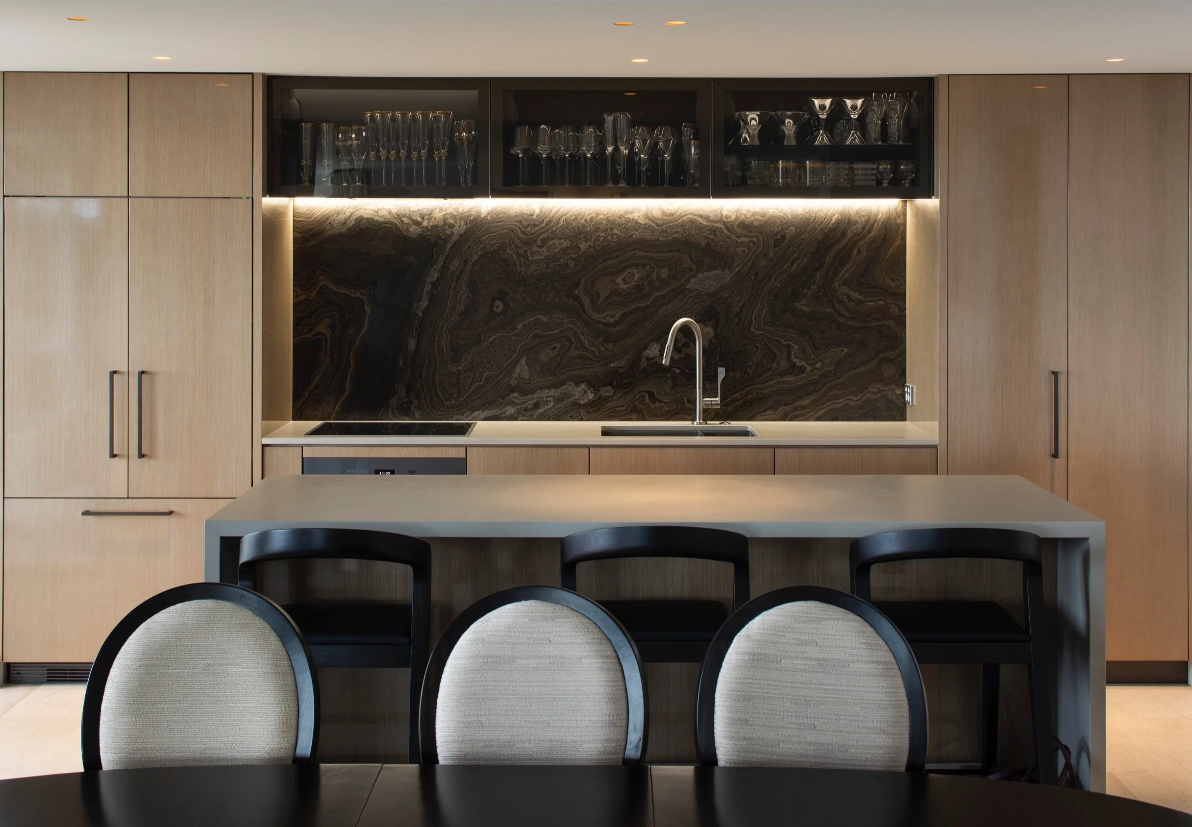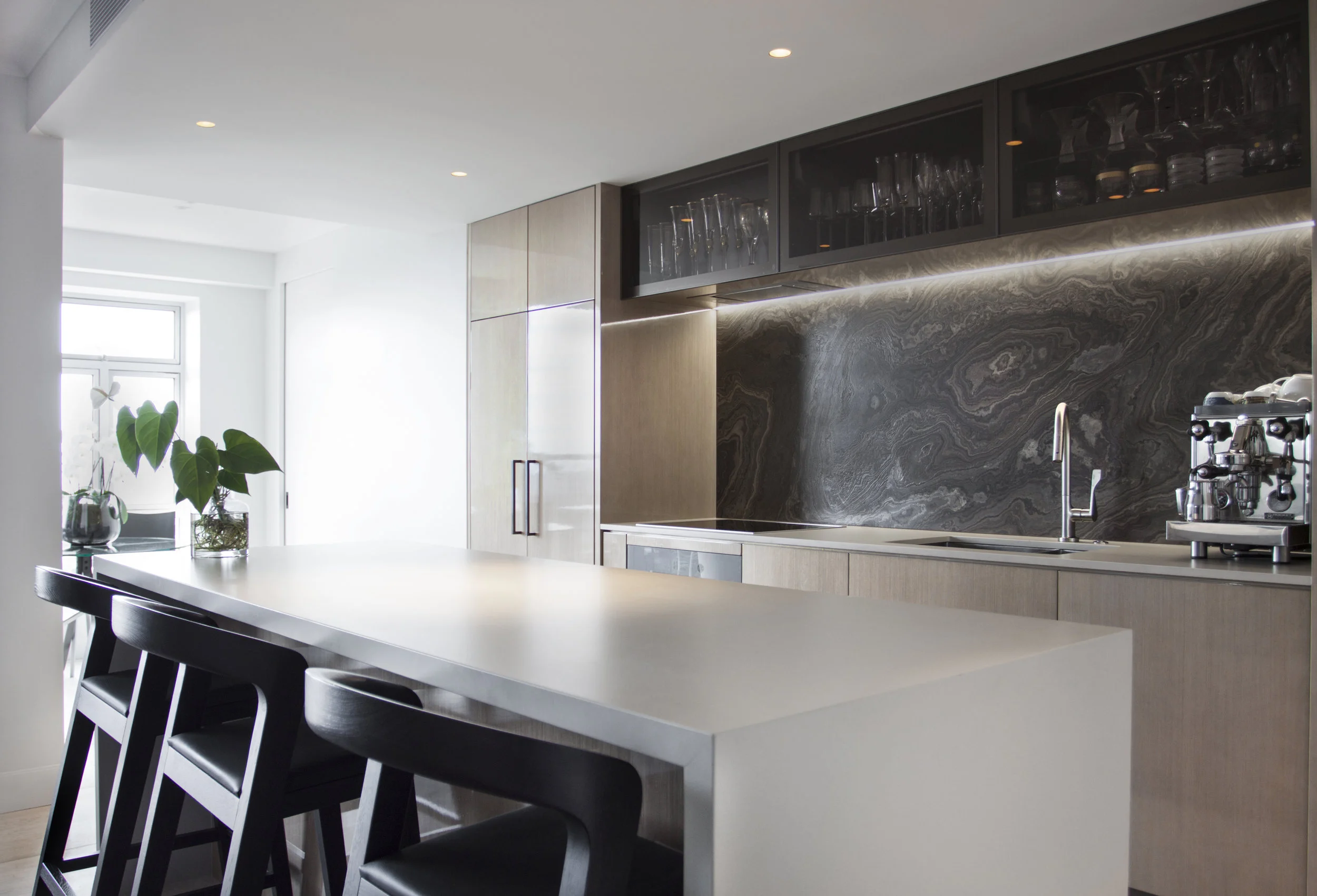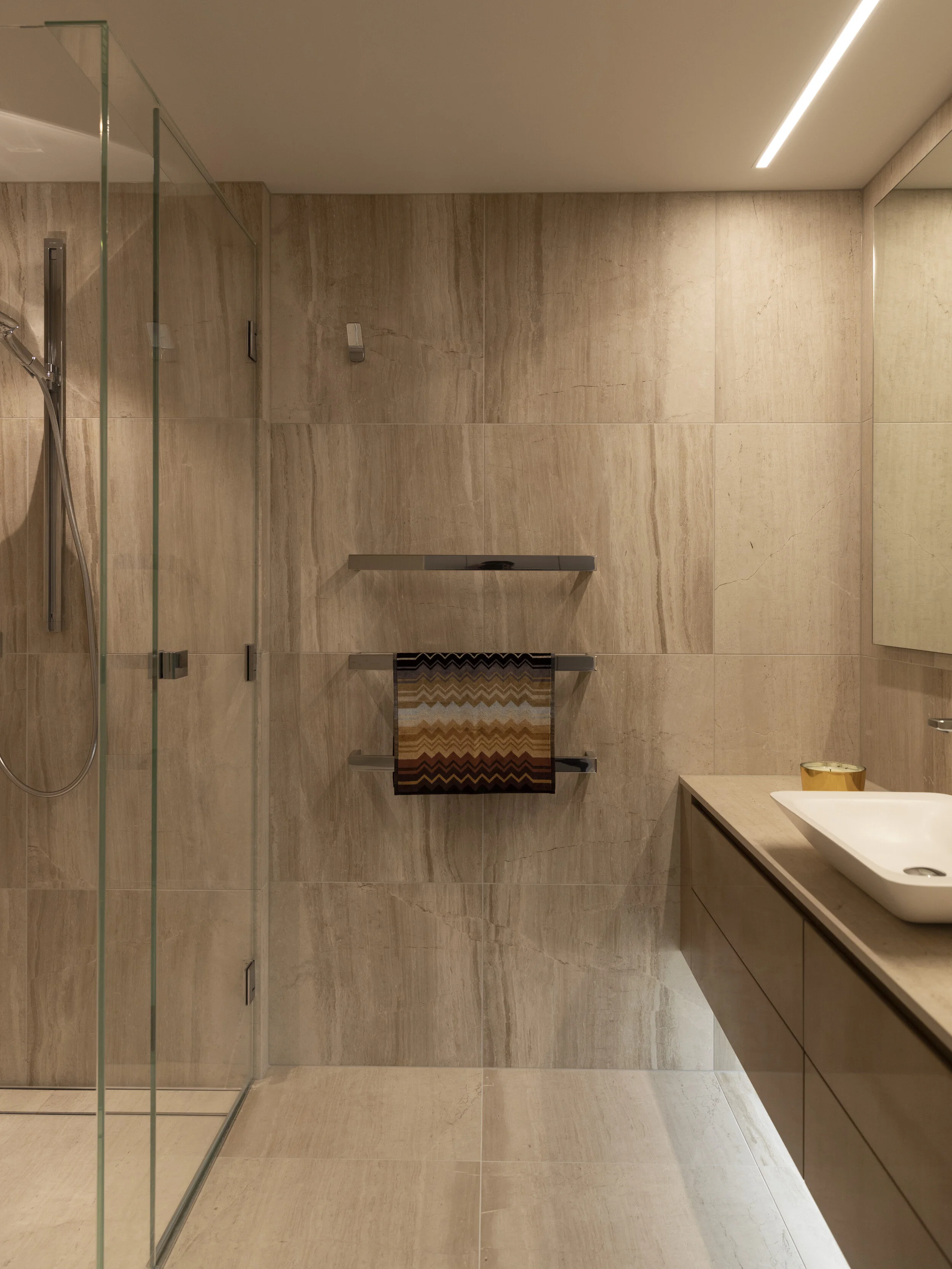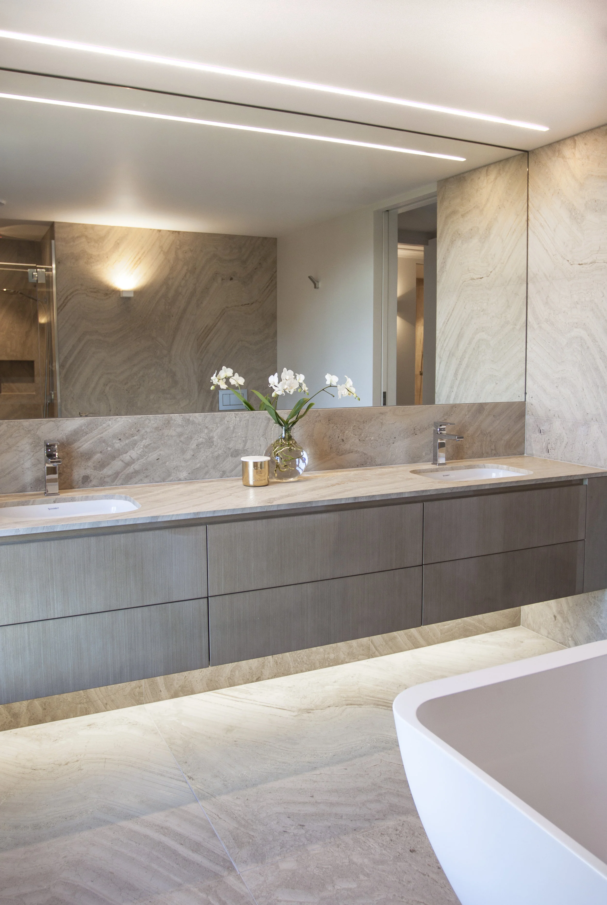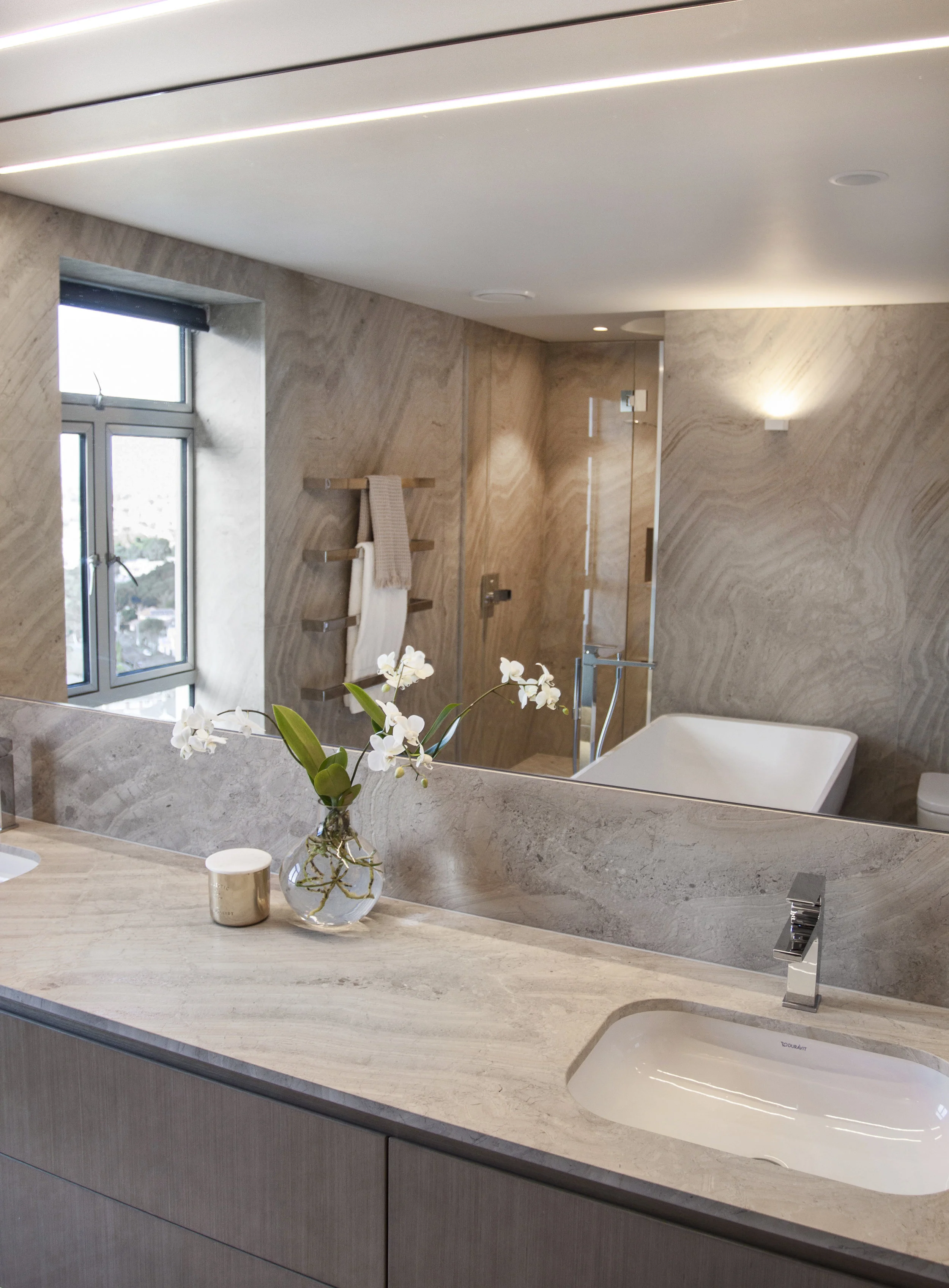 The Pines exudes quality furnishings, superior craftsmanship and timeless charm in line with the client’s vision. Remniniscent of a luxury New York apartment with expansive marble bathrooms, wide angle views, subtle detailing and traditional features preserved to retain character. New detail is introduced within the custom designed joinery, cabinetry and stone work with gold and bronze undertones complementing and further enhancing the sun-drenched spaces. The lighting, detailed finishing and specific layouts of the marble throughout the ensuites and kitchen showcase the unique qualities, textures and formations displayed.